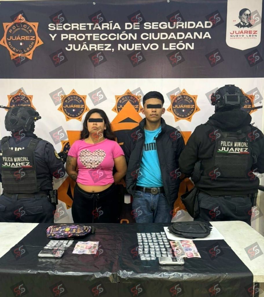 Al abordarlos, los sujetos fueron identificados como Armando Tadeo “N”, de 18 años, y Karla Jacquelin “N”, de 22 años. Debido al reporte previo, los oficiales realizaron una inspección preventiva, localizando diversas bolsitas con una sustancia sólida y cristalina con características del narcótico conocido como cristal, así como dinero en efectivo.
